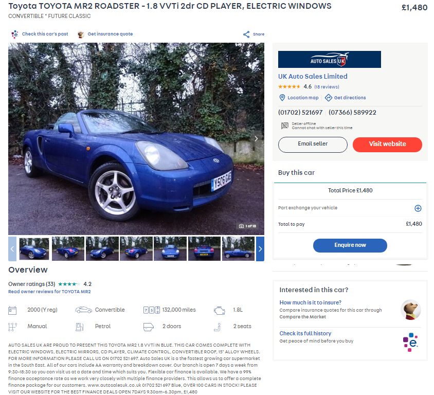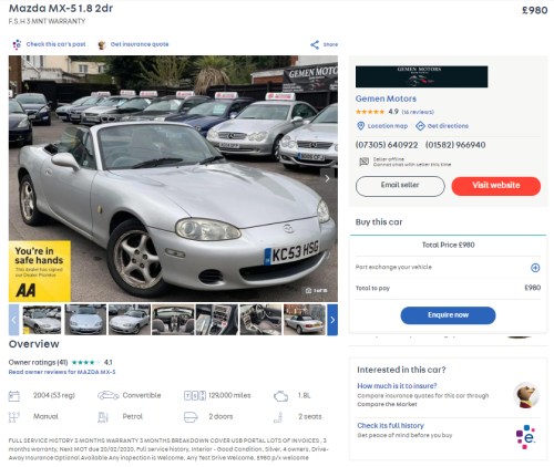 Now of course there had to be an MX-5 on this list. It’s just astonishing that this modern classic can be had for under grand. And that too in Mk II guise. This one comes with full history and a three-month warranty, but flat cap and driving gloves are sold separately.