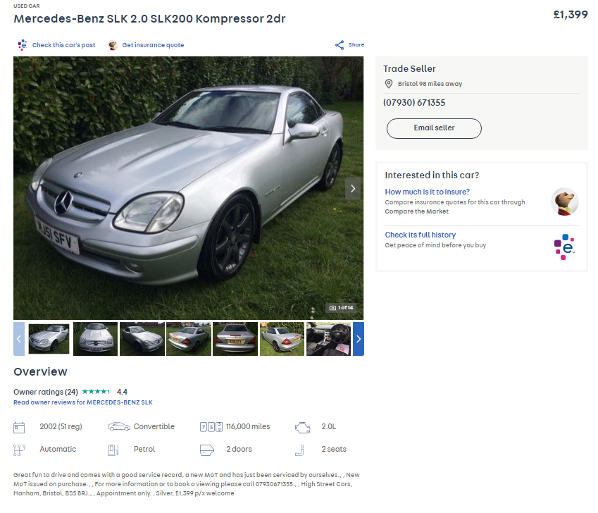 A Mercedes roadster at this money? Oh Lord won’t you buy it for me? And the Lord said: ‘buy it yourself you cheapskate – it’s less than 1400 quid!’ Solidity and class assured.