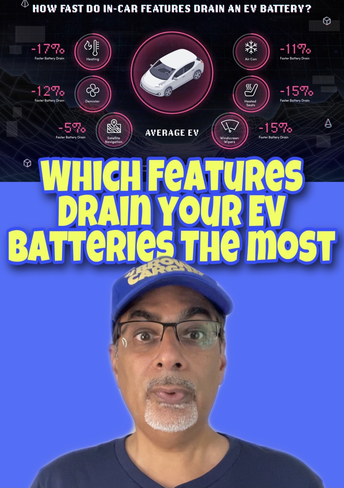 They tested the battery range of 3 cars – the Hyunda Kona, Volkswagen ID.3 and Tesla Model 3. Heating drains the battery most, by 17% more than normal. Windscreen wipers and heated seats are next at 15% each. Demisters are responsible for 12% and air con for 11%. Sat nav only 5%.