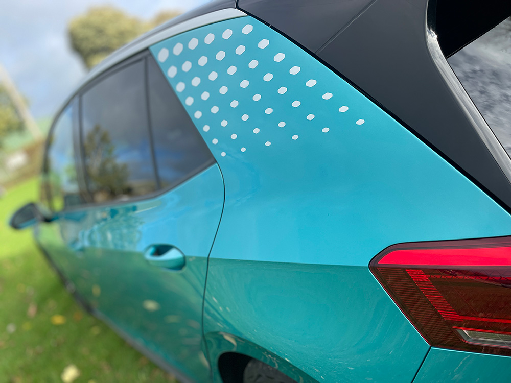 The rounded-bubble styling is both very 21st Century and appealingly friendly with some neat little touches, such as the sloping front, sharp roof spoiler, and the geometric motif that appears not just on the C-Pillar decals, but also the front bumper and even within the headlights. The white-on-black VW logo roundel is also a neat touch on the ID.3 Max Pro Performance tested.