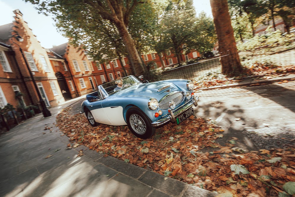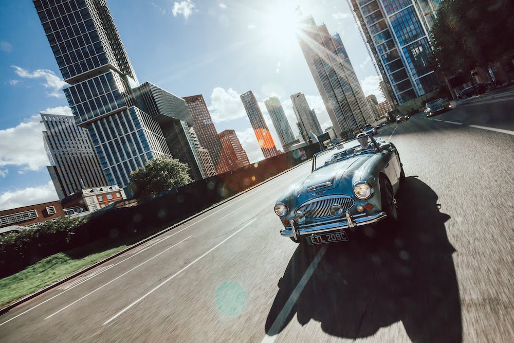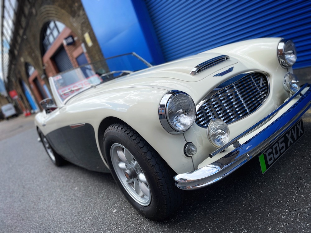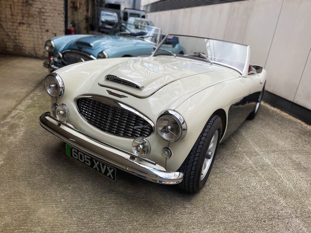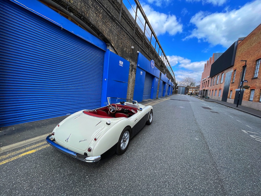 A pair of stunning and beautifully restored Austin Healeys sit awaiting my attention. The Blue car is a 1965 Healey 3000, and the white car is a 1957 100/6. It’s a bright sunny day, we’re in the very heart of London, and I’ll be driving both. But these aren’t ordinary classic British roadsters. They’re hiding a secret.
