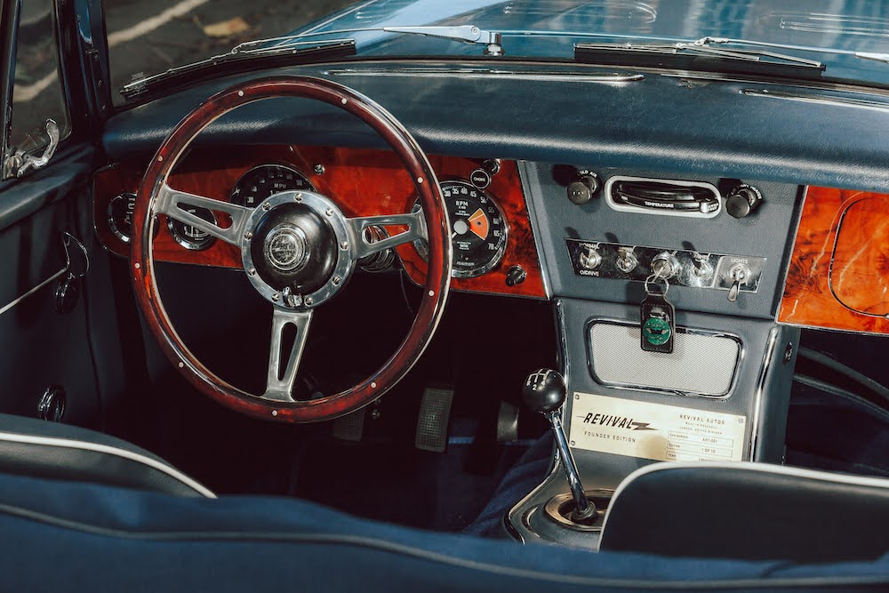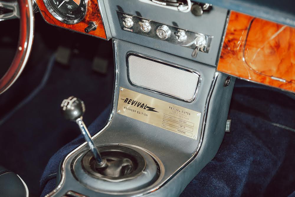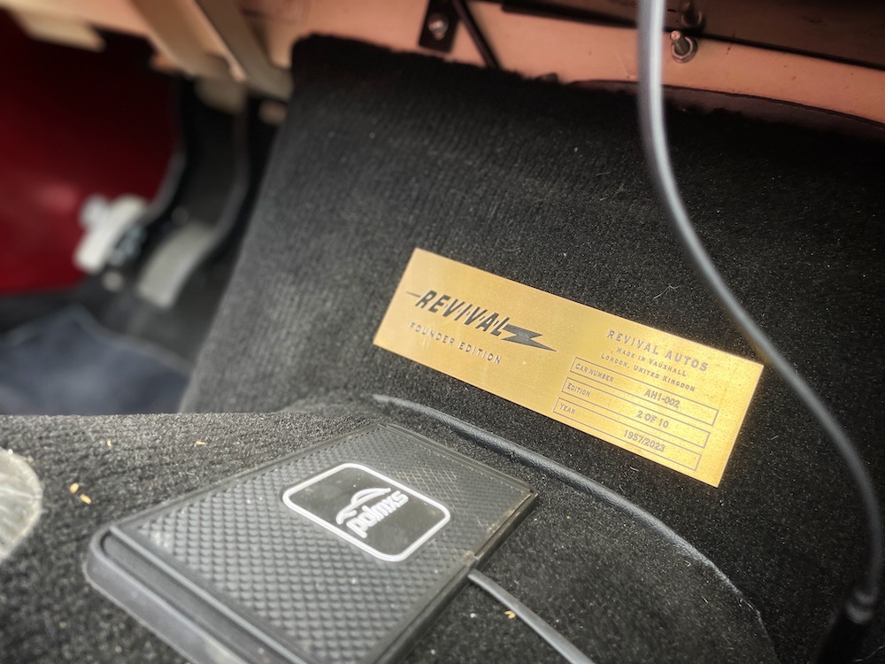 Apart from a digital display box hidden in the glovebox indicating charge, an instrument panel digital display that will soon be available replacing the volt-meter, and USB charging, there’s nothing inside the car to indicate this is an EV, apart from the Revival Autos plaque.