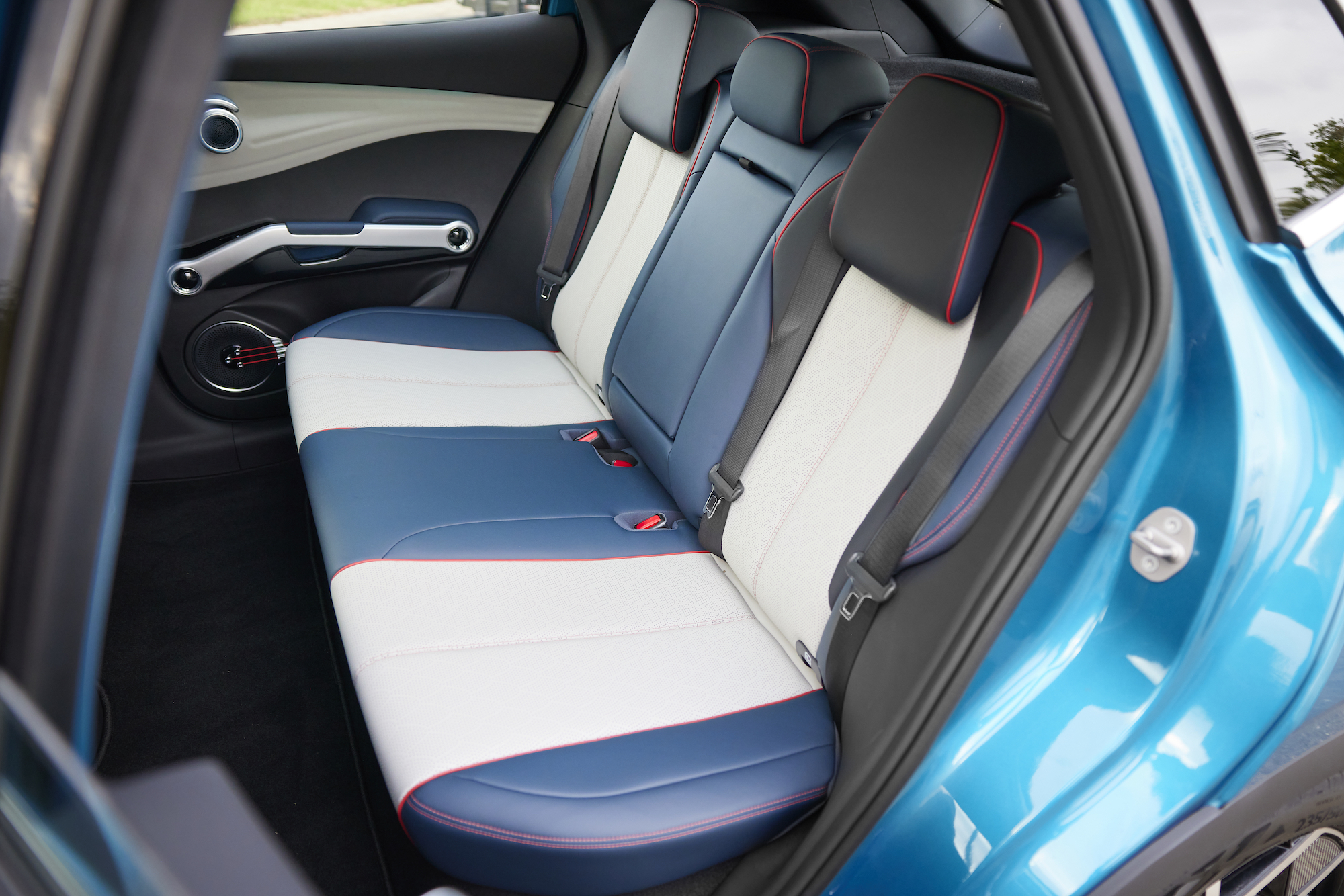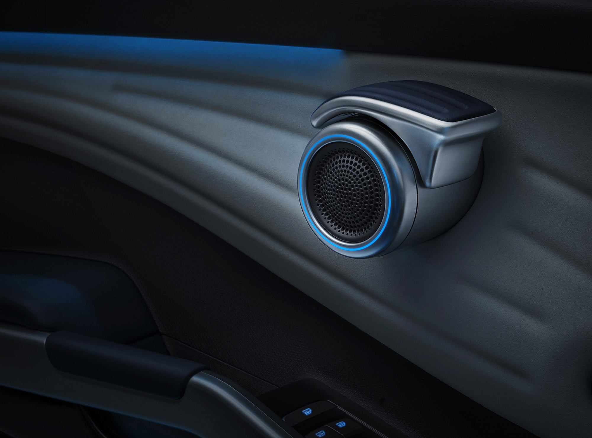 Yes, there multiple materials that curve and twist around each, fascinating to behold and fondle, but the door release level sliding along the circumference of a pronounced speaker tweeter, is a compelling combination of form and function. Nothing beats the door pockets being contained by tensioned stings, exquisitely presented and yes, irresistible to the strum.