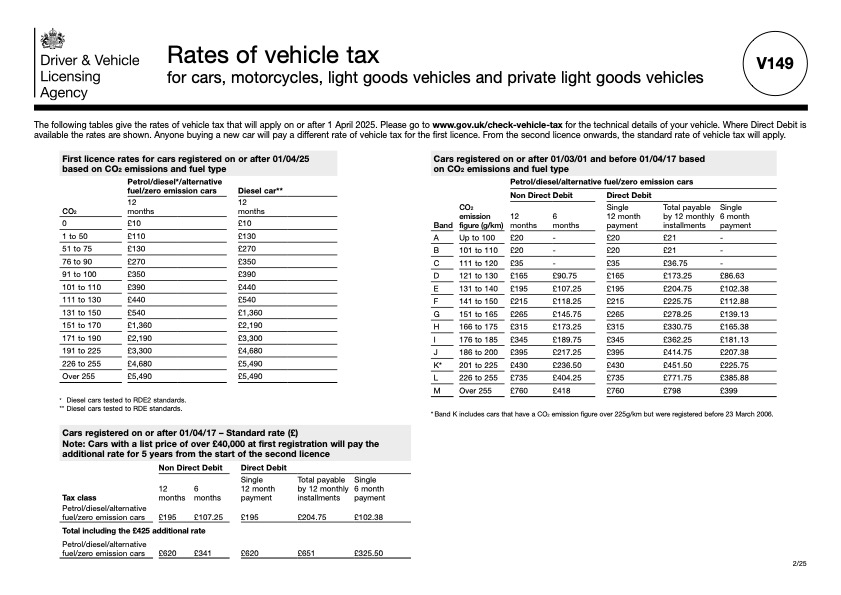 I’ve included both the 2024 (below) and 2025 (above) V149 rate tables below for you to download. Make sure you check your car’s emissions or registration year and see exactly where you stand.