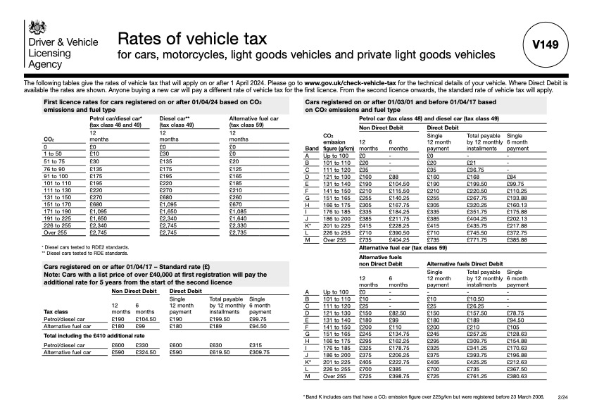 I’ve included both the 2024 (below) and 2025 (above) V149 rate tables below for you to download. Make sure you check your car’s emissions or registration year and see exactly where you stand.