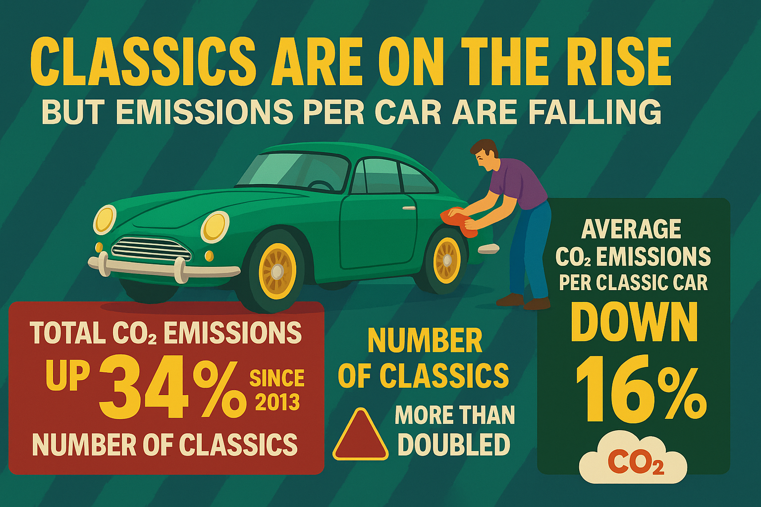 Even more surprising, average CO₂ emissions per car have dropped by 16%. That means each individual classic is actually polluting less than it did a decade ago. Now that’s what I call an environmental motoring miracle.
