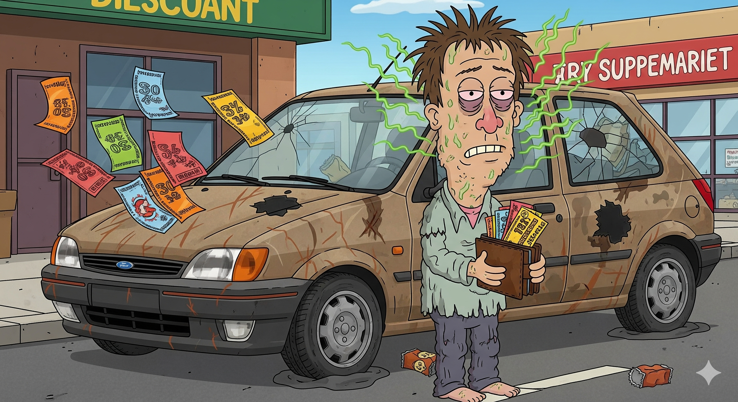 - Battered Fiesta? You’ve skipped a shower and your wallet’s stuffed with supermarket discount vouchers.