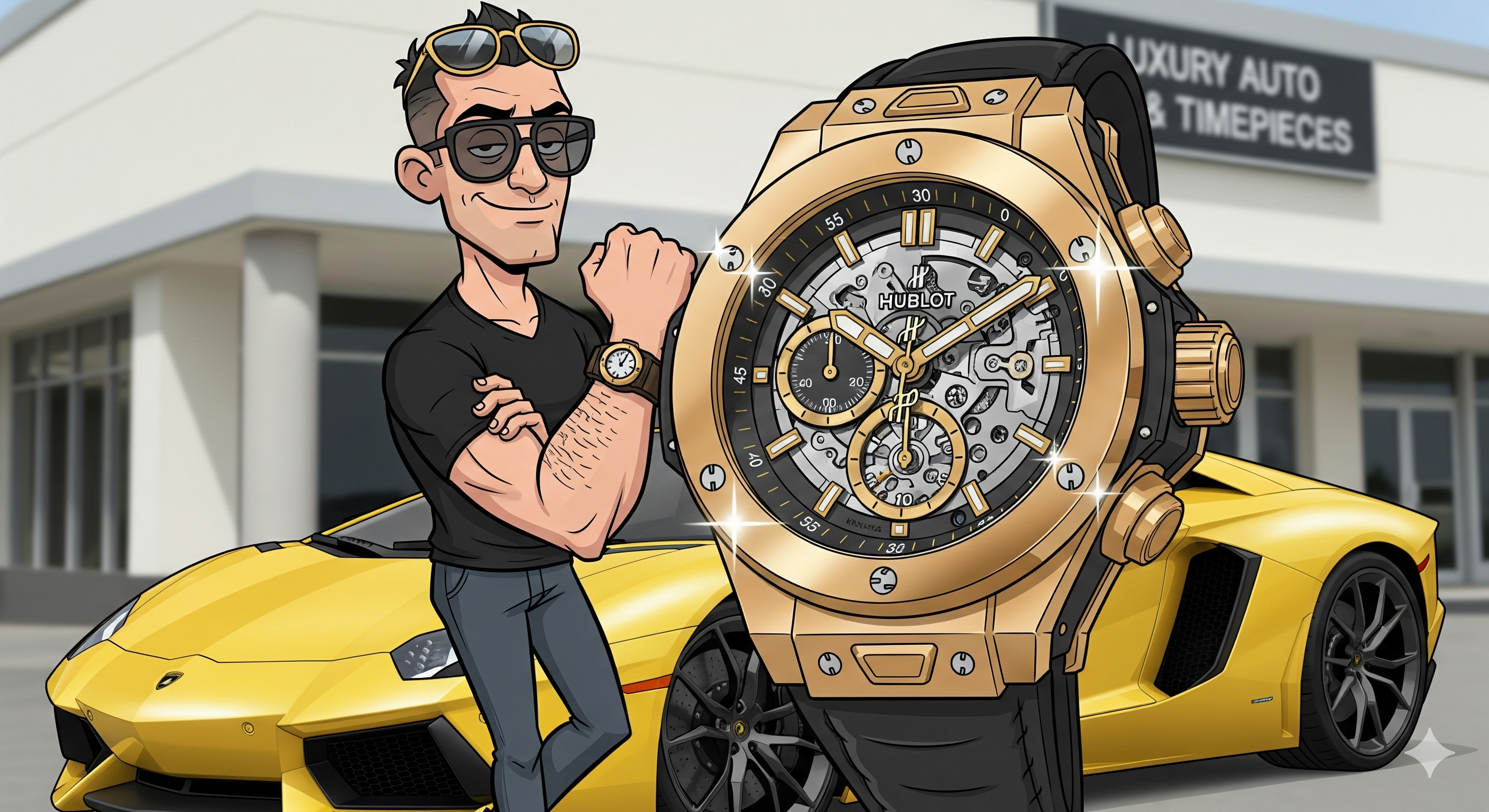 - Lamborghini Aventador – Small man, big Hublot watch.