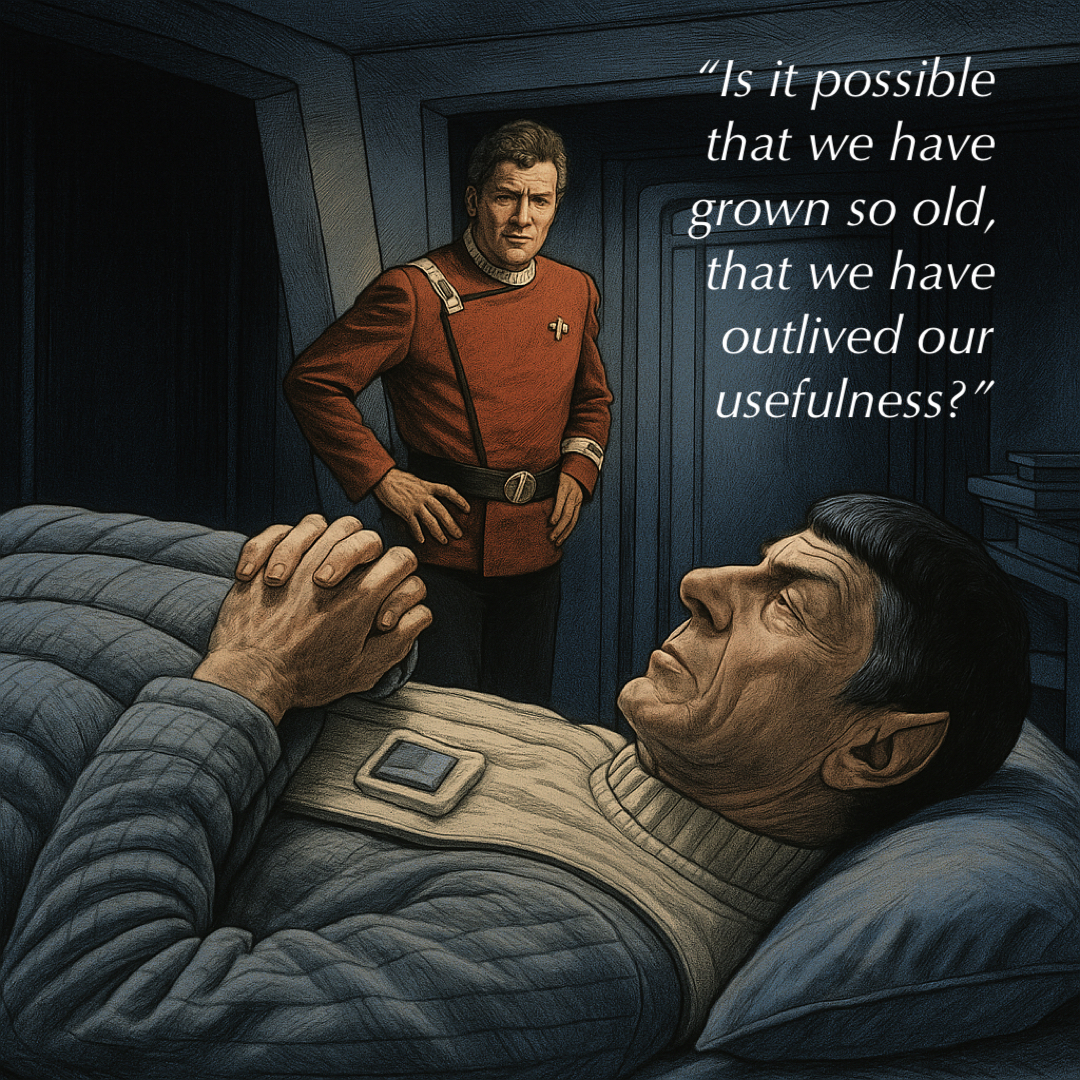 Which brings me to one of my favourite moments in Star Trek VI: The Undiscovered Country. A weary Spock turns to Kirk and sighs: “Is it possible that we have grown so old that we have outlived our usefulness?”