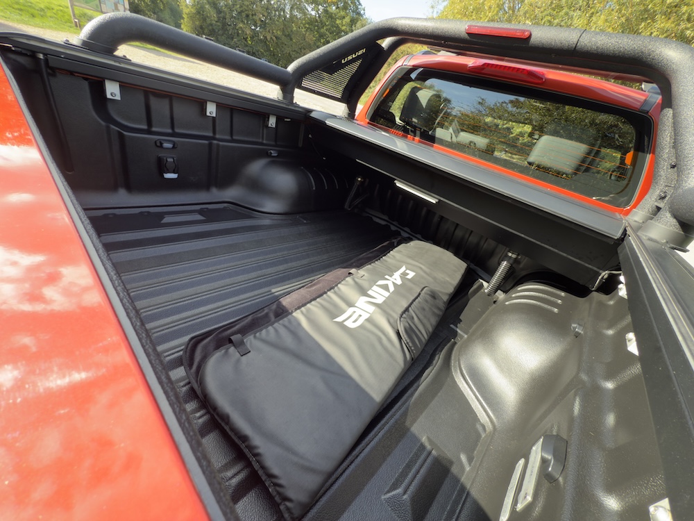 Now let’s total up those extra bits. Deep breath and: Special Paint Finish Sienna Orange (£600); Bonnet Protector (£172.08); Lazer Linear-36 Elite (£970); Lazer Linear-6 Elite+ (£579); Front Cladding Kit (£410); Over Fender Set (£811.96); Wind Visors (£136.08); Custom Side Bars (£457.75); Alloy Cross Bars + Roof Rails (£536.50); Sports Bars (£432.50); Electric Roller Shutter (£1,740); SportGuard Under-rail Liner (£388.33); Tow Bar & 13-pin Electrics (£487.92); LED Interior Upgrade (£50.59); Illuminated Door Sill Covers (£388.29); 12V Socket in Load Bed (£237.50); Bonnet Lift (£114.83); Wireless Charger (£133.50).