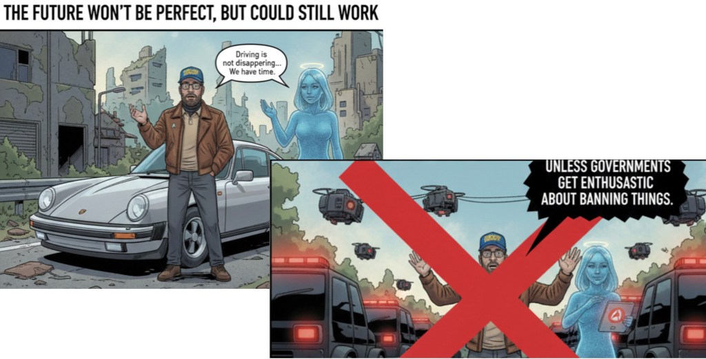 Her broad conclusion was comforting: driving is not disappearing tomorrow. Or next year. Or the year after that. Or the year after that, unless governments suddenly get very enthusiastic about banning things, which could happen.