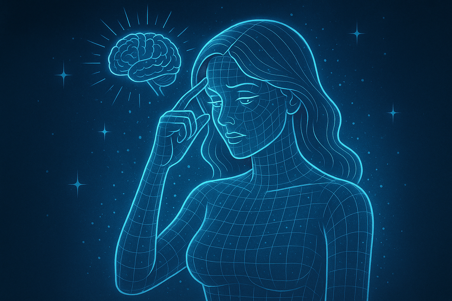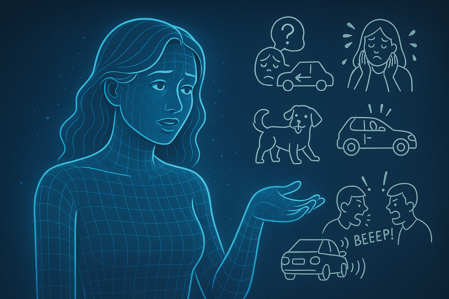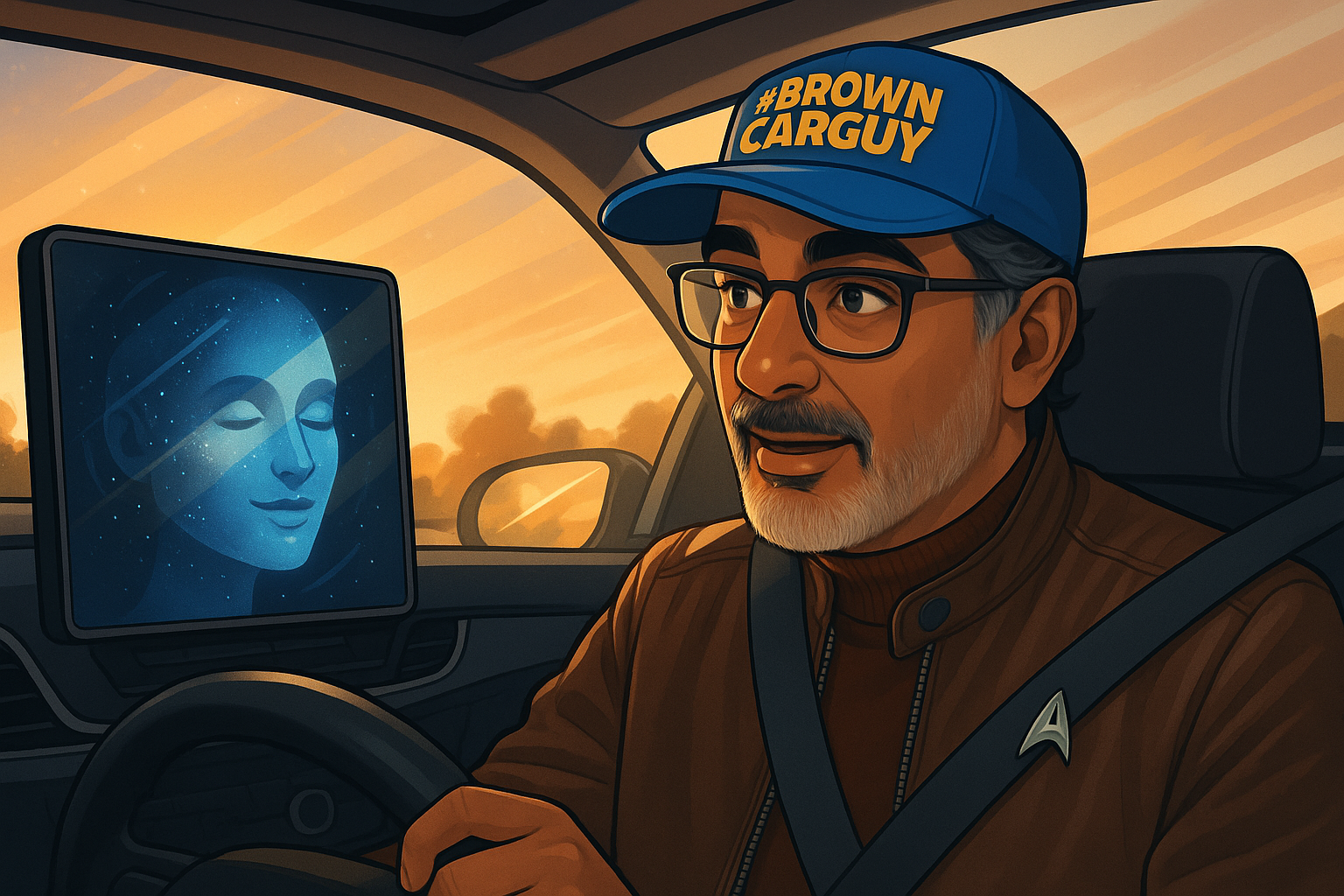 I normally type my queries to ChatGPT, but since I was at the wheel, instead, my passenger seat lit up with a holographic wireframe being, glimmering with bytes that randomly brightened and dimmed, within a graceful female form, appearing as if a digital angel.