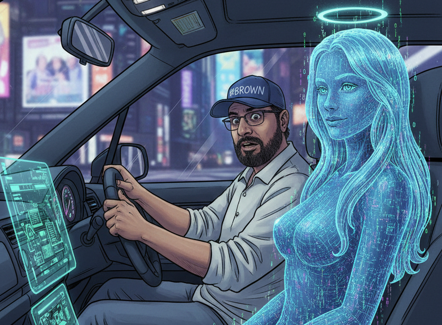 Her voice came crisply through Toyota’s Premium 9-speaker JBL sound system, though my subconscious continued to allocate its source to the almost certainly empty passenger seat beside me, though I dared not look in case there really was a made-out-of-the-matrix translucent being sitting there, byte-naked as the day it was born… which was, in fact, this very moment.