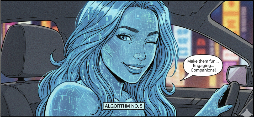 At that point, I got the unnerving sensation that she was sidling up to me, fluttering invisible eyelashes and emitting the scent of Eau de Overheated Servers. Was that Silicon Musk or Circuit Noir my nostrils detected? Ah no; it was Algorithm No. 5, of course!