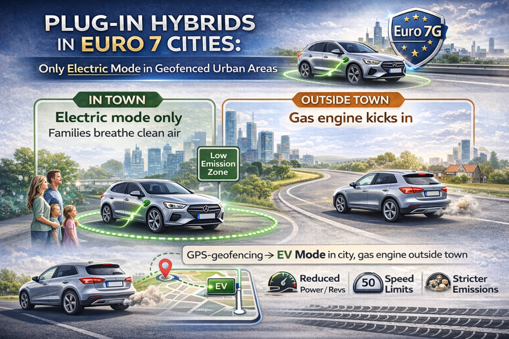 Plug-in hybrids receive a regulatory twist. Euro 7 formalises the requirement for certain PHEVs to prioritise electric-only driving in designated low-emission or zero-emission zones. Using GPS geofencing, the car can detect when it has entered a restricted urban area and automatically switch to battery power.