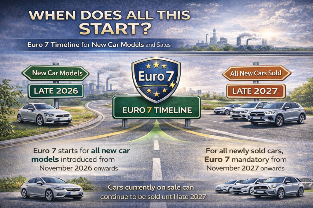 For brand-new car models introduced from November 2026, Euro 7 compliance is mandatory. For all new cars sold – including existing models already on sale – the rules apply from late 2027. That means manufacturers can continue selling current Euro 6-compliant cars until then, but any entirely new model launched after November 2026 must meet the updated standards from day one.