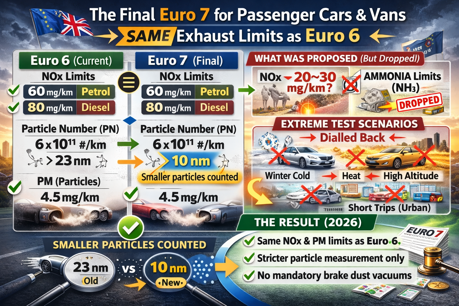 The headline tailpipe limits for cars and vans remain largely aligned with Euro 6. However, the monitoring becomes stricter, durability requirements are extended, and new areas of emissions – previously overlooked – are brought into scope.
