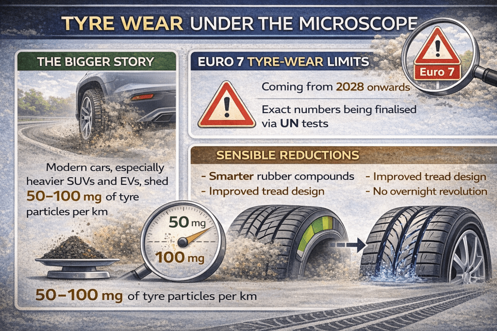 Tyre wear and brake dust are now part of the regulatory conversation. Modern cars, particularly heavier SUVs and electric vehicles, can shed between 50 and 100 milligrams of tyre particles per kilometre. Euro 7 introduces limits on these non-exhaust emissions from 2028 onwards, with detailed figures being finalised under a UN testing procedure.