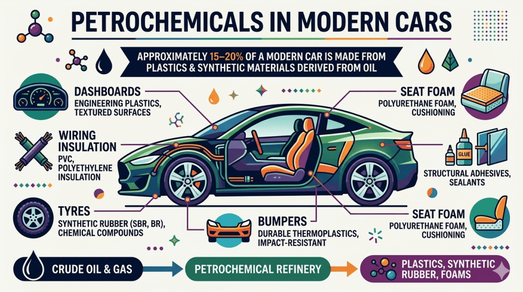 In fact, roughly 15–20% of a modern car consists of plastics and synthetic materials derived from petrochemicals.