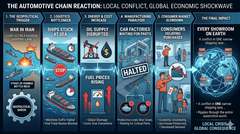 A conflict in one narrow shipping corridor can ripple outward across energy markets, global trade networks and consumer confidence. Ships can become stranded. Fuel prices can surge. Car factories can find themselves waiting for parts. And buyers can suddenly decide that purchasing a new vehicle feels like too big a financial risk.