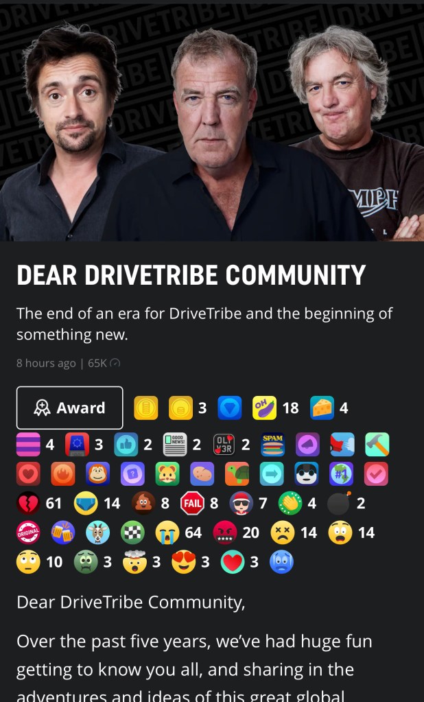 I’m really sad and sorry to see DriveTribe go. Not least because they were among the first major outlets to give me freelance work when I returned to the UK at the beginning of 2019 (thank you Jim Murray Jones & Tim Rodie) although that stopped with the advent of Covid. Nonetheless I continued to put my own content on DriveTribe because of the extensive automotive audience the channel reached. Additionally I know it provided an outlet for a lot of young new content creators that found an audience through this platform that they could not otherwise have got – I feel saddest for them.
